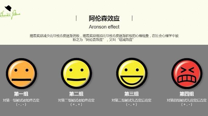 在职场或生活中,人们经常会因为某些奖励的增加或减少,心态变的积极或消极,这种现象就是许多人都听过的阿伦森效应。该效应在职场上,经常作用在老板和员工上,如果老板对原因的赞扬或奖励不断增加,员工就会变的很积极;反之,如果老板对员工的赞扬或奖励不断减少,员工就会变的很消极,跳槽的可能性极大。
