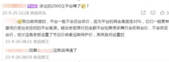 但是也有网友表示自己就是做民宿的平台,一般情况下不会私自后台改价,因为平台提前预定出一间房得到的佣金是固定的10%,他们更希望能够低价卖出去去抢别的平台客源,超出民宿老板原价的金额平台如果想多赚一点只能够改前台价,不能够更改后台价,估计是民宿老板已经设置了节日假或者是远期保护价,后台系统自动更改的。