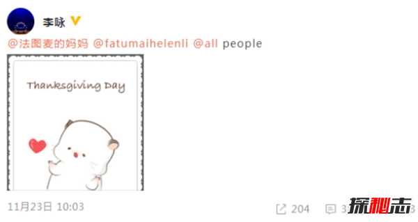 2017年11月23日,李咏发布最后一条微博,感谢了妻女以及所有人,哈文则在下方甜蜜互动:“感恩节快乐。”