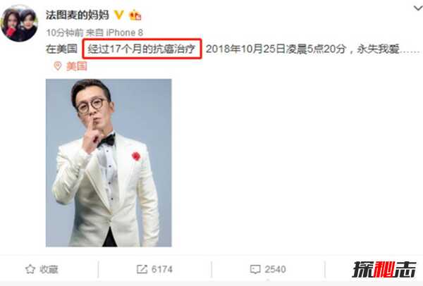 据报道称,就在10月29日上午9时许,李咏的妻子哈文在微博上发文称李咏去世的消息:在美国,经过17个月的抗癌治疗,2018年10月25日凌晨5点20分,永失我爱…。”