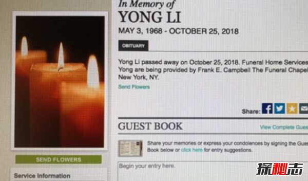 据有关消息称,李咏葬礼于当地时间28号早上10点(北京时间28日晚上10点)在位于纽约的麦迪逊大道1076号的弗兰克林坎贝尔殡仪馆举行。今早,李咏妻子哈文发文确认李咏去世的消息。