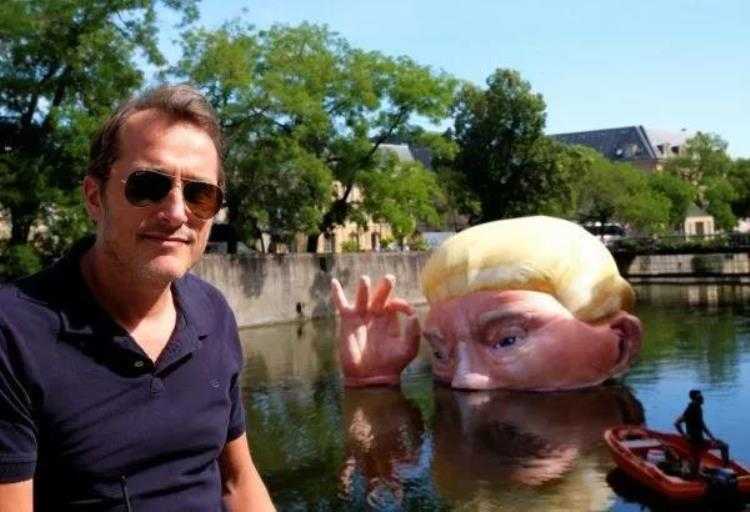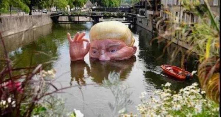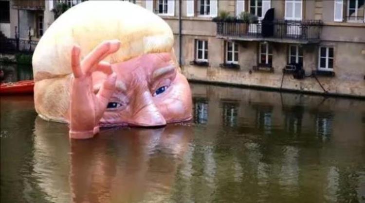 法国艺术家巨型作品震撼亮相特朗普头像半淹在河上手势搞笑