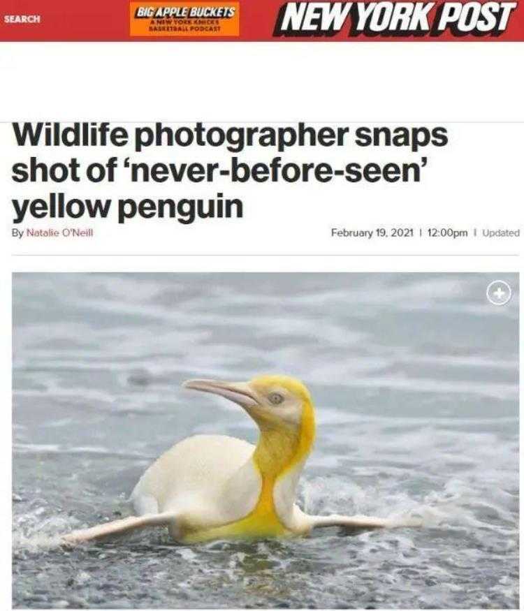 实际上,并非所有的白化物种都是纯白色的,像这种金白色或者浅金色也是正常的。比如2019年12月的时候,有一位名叫伊夫·亚当斯的野生动物摄影师在位于大西洋的南乔治亚岛进行拍摄时,就意外遇到了一只白化企鹅,其头部和胸前的颜色就是金黄色的。