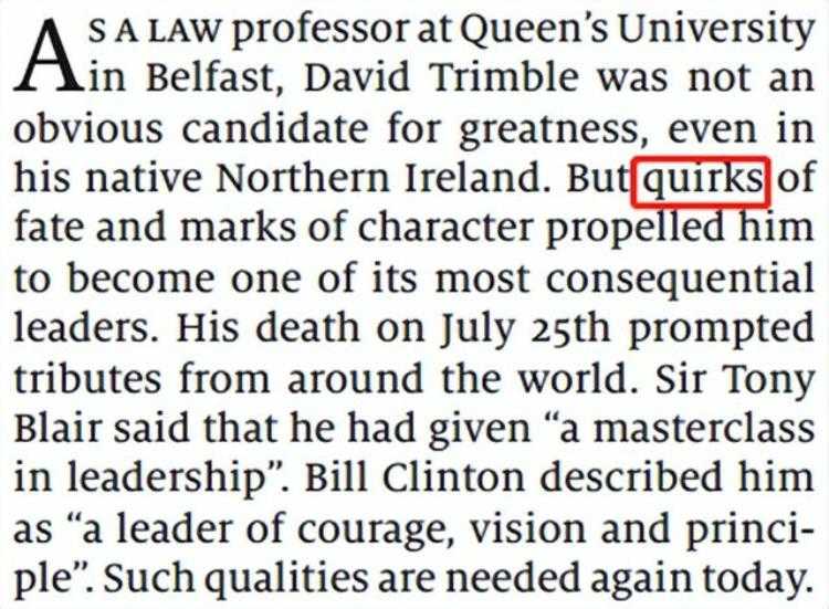 作为贝尔法斯特女王大学的法学教授,戴维·特林布尔(David Trimble)并不是一位明显的伟大候选人,即使在他的家乡北爱尔兰也是如此。但是命运的巧合和性格的烙印促使他成为世界上最重要的领导人。他于7月25日去世,引发了世界各地的悼念。托尼·布莱尔爵士说,他给世人上了一堂“领导力大师课”。比尔·克林顿称赞他是“一位有勇气、有远见、有原则的领袖”。今天我们仍然需要这样的品质。