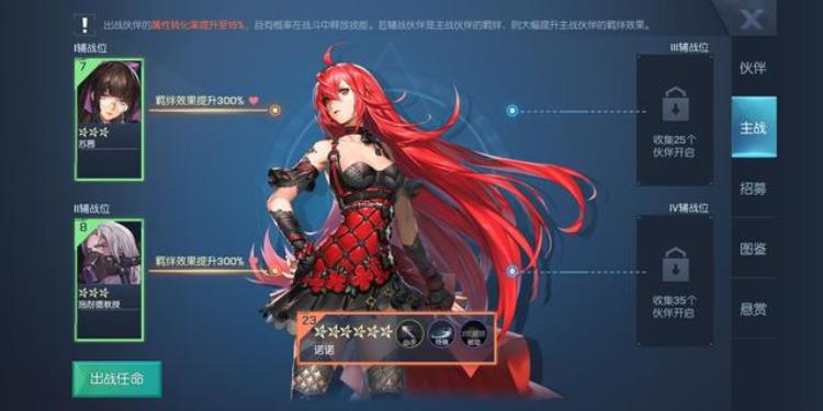 可任命最多1位主站伙伴和4位辅战伙伴,辅战伙伴位置须解锁更多伙伴。所有出战伙伴的属性转化为角色属性的转化率从12%提升到15%如果设置的辅战伙伴是主战伙伴的羁绊时。主战伙伴对应的羁绊效果提升300%伙伴技能分为,必杀,言灵,特殊。被动四种。只有主战伙伴的被动技能生效,可直接提升玩家的属性。战斗中无法更换出战伙伴。