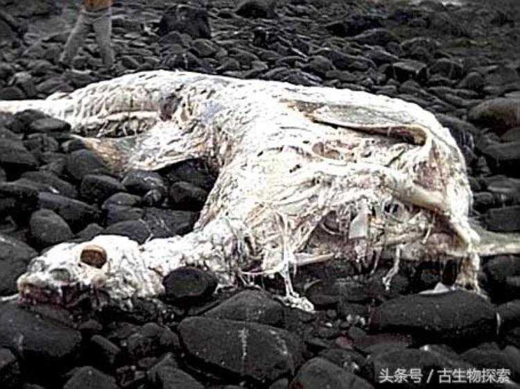 图注:海滩上高度腐败的姥鲨尸体,非常像蛇颈龙,图片来自网络