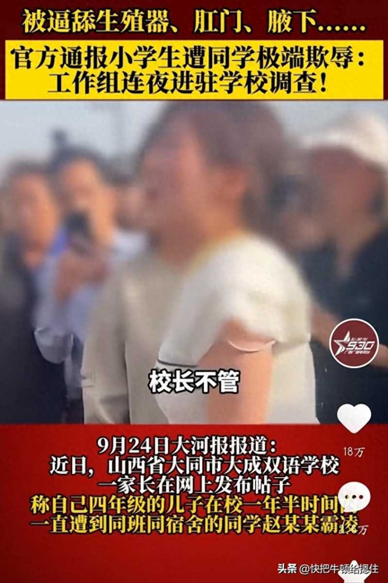 16、山西省大同市某学校一家长在网上发布帖子称自己四年级的儿子在校一年半时间内一直遭到同班同宿舍的同学赵某某霸凌。据孩子妈妈说,她曾一直向学校和校长反映,校方不仅不管,甚至还没给出任何合理的处置措施。这两个恶魔所干的事情简直无下限,也令人气愤不已。。。。。