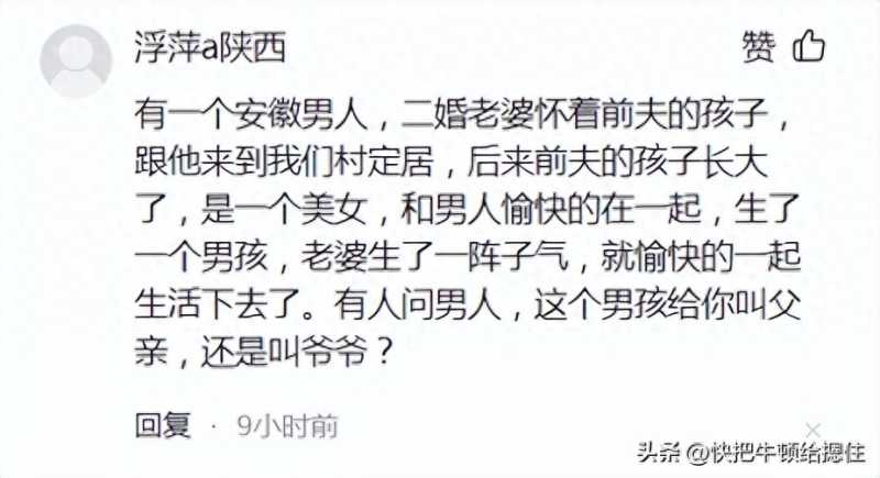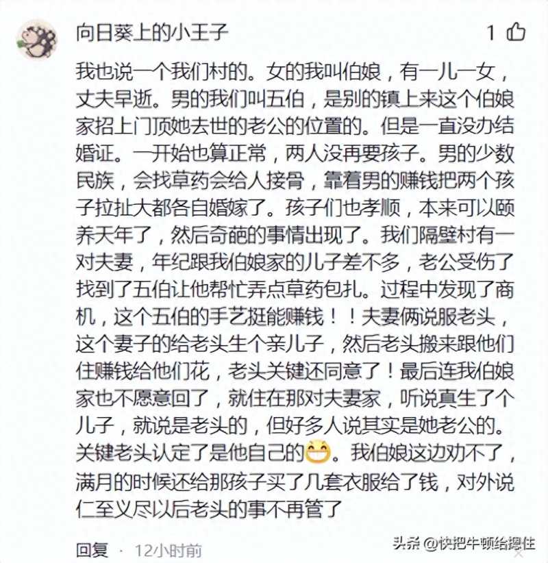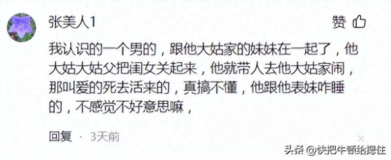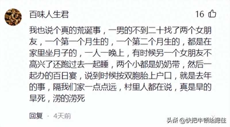 1、百味人生君:我也说个真的荒诞事,一男的不到二十找了两个女朋友,一个第一个月生的,一个第二个月生的,都是在家里坐月子的,一人一晚上,有时候另一个女朋友不高兴了还跑过去一起睡,两个小都是奶奶带,然后一起办的百日宴,说到时候按双胞胎上户口,就是去年的事,隔我们家一点点远,村里人都在说,真是旱的旱死,涝的涝死。