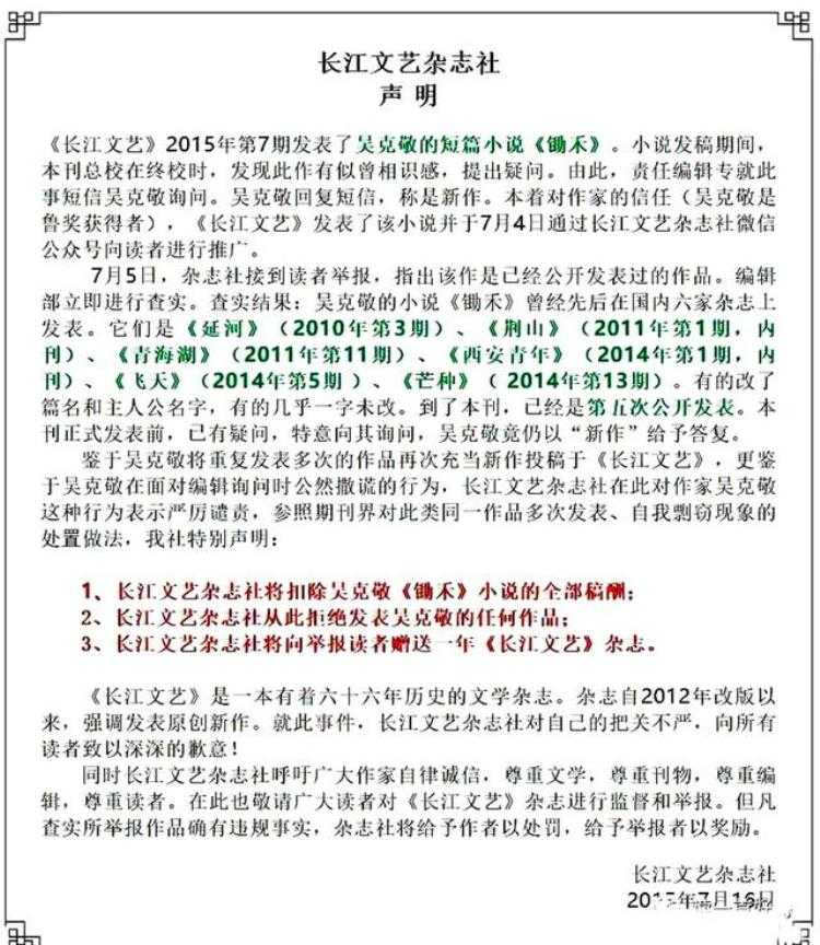 鉴于吴克敬将重复发表多次的作品再次充当新作投稿于《长江文艺》,更鉴于吴克敬在面对编辑询问时公然撒谎的行为,长江文艺杂志社在此对作家吴克敬这种行为表示严厉谴责,参照期刊界对此类同一作品多次发表、自我剽窃现象的处置做法,我社特别声明: