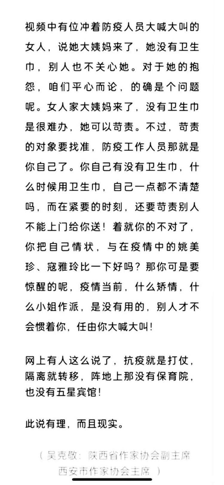 近日,一篇出自陕西省作家协会副主席、西安市作家协会主席吴克敬的文章《扎在长发上的橡胶手套》引发舆论争议。文中吴克敬批评了“因卫生巾而向防疫人员哭诉”的一名西安女子,称其“矫情”、“小姐做派”。