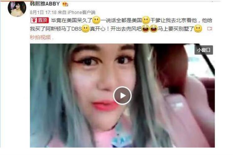 韩熙雅在视频中说道:刚从美国回来,去北京见干爹,这是他给我买的阿斯顿马丁DBS,然后把美元全换成了人民币,真开心!开出去兜风吧,马上要买别墅了!真的很想知道是哪位干爹,口味这么奇特。