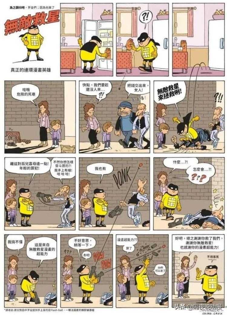 还有接下来的这篇“制服歹徒”的故事,一早上无敌救星正在准备着早餐,突然透过下面的分镜发现有两个歹徒正在对着一对母子实施抢劫,于是无敌救星跳下去“从天而降”。