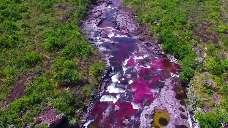 第二名,哥伦比亚五色河。这条河犹如彩虹一般,红色蓝色黄色橙色和绿色的瀑布倾泻而下,呈现出炫目的光彩。是什么原因导致河水呈现出如此多的颜色呢?科学家表示,这种现象源自河水中独特的水生植物。水位的变化加上光照的强度影响着植物的颜色,使河流成为一幅流动的画布。这是一个蓬勃发展的生物多样性系统。水生植物和鱼类交织在一起,在五颜六色的河水中翩翩起舞,让游客为之着迷。