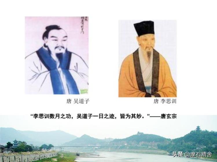 父子二人精擅山水画。李思训在展子虔“青绿山水”画法启发下,创“金碧山水”一格,极富盛唐气象。思训丹青,擘山渲水之余,偶画水族,后世传其有神奇幻化之功。