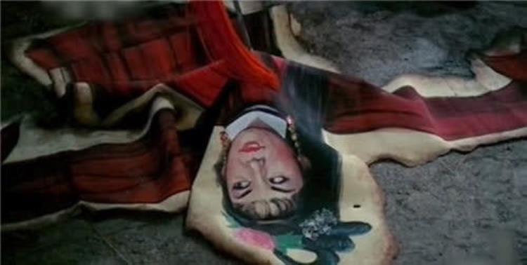皮囊上的女子长得柳叶弯眉,樱桃口,虽不是闭月羞花,也算得上大家闺秀。在皮囊旁摆放着女子的衣服,衣服上有清楚的纹理和样式。