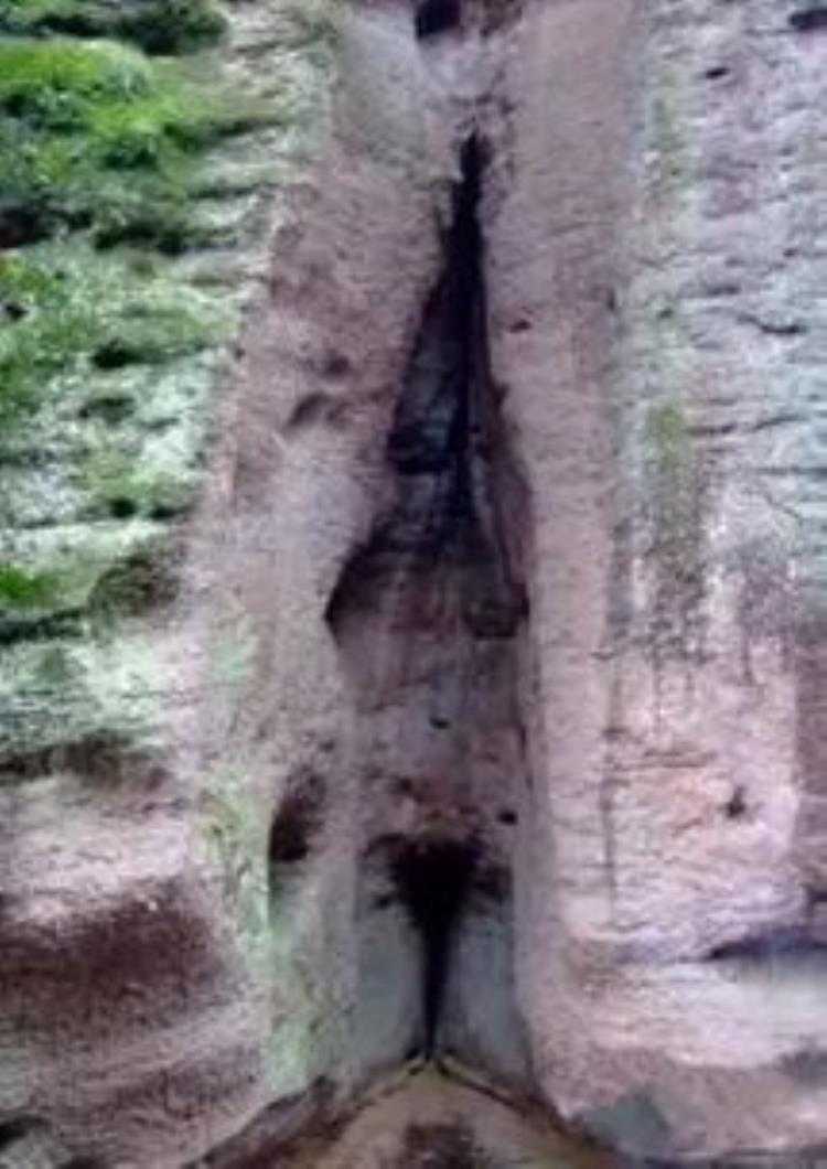 这个裂缝高得很,至少有十几米高,而且到了距离地面近的地方,岩洞口又稍稍扩开了一些,正好像是女性的坐姿,微微地分开双腿,把阴户稍稍张开了。