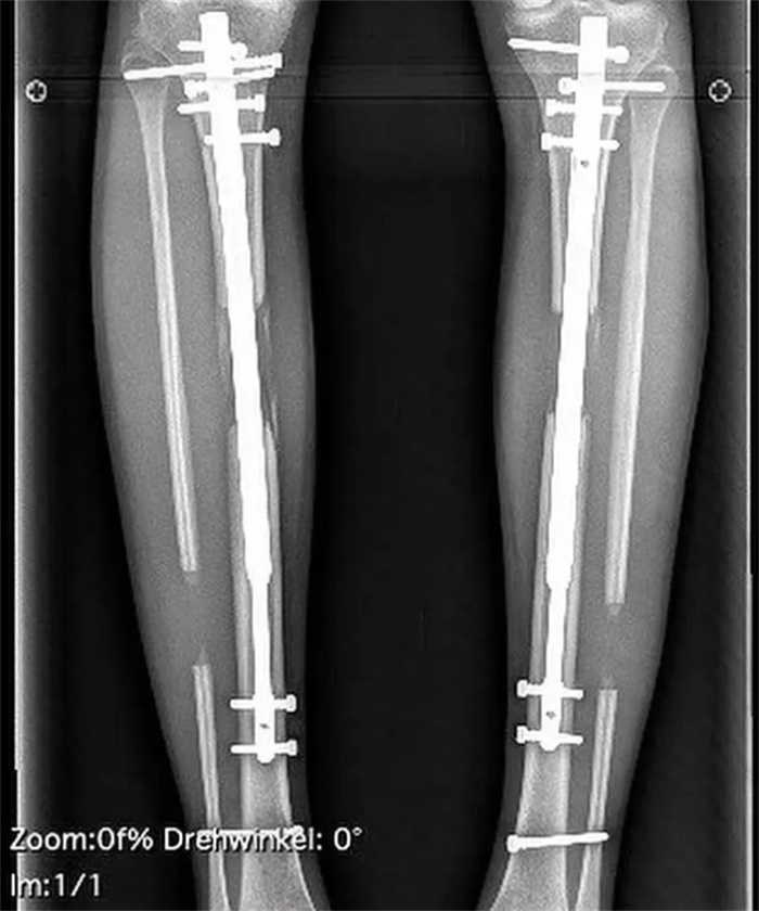 第一次手术,他的胫骨和腓骨被打断,然后挖空了胫骨内部,取出骨髓,再将一根钢杆放入骨头内(可伸缩),用螺钉将其固定。最后还要用钉子将骨头和外部的仪器固定。