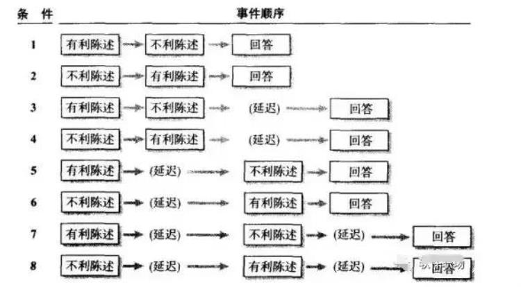 结果发现,被试者听完连贯的陈述后,间隔一段时间在作出回答(条件3和4),就会出现首因效应;而如果两部分陈述之间存在延迟(条件5和6),就会出现近因效应。而条件1、2、7、8 则没有出现明显的首因效应和近因效应。