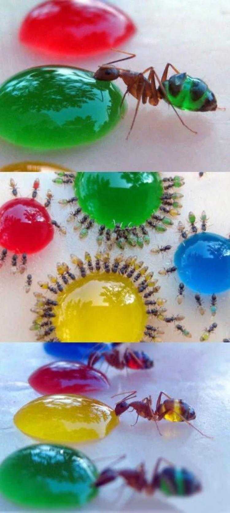 8.【多彩的蚂蚁】最近,英国人巴布的妻子意外发现,蚂蚁在吸食了洒在地上的牛奶后,腹部变白。于是巴布突发奇想,利用不同颜色的糖水吸引蚂蚁,拍下了一组奇特的图片。巴布说,蚂蚁腹部是半透明的,显然它们一定程度上也能辨识颜色,相对红色和蓝色来说,它们更爱吸食浅黄和浅绿色糖水。