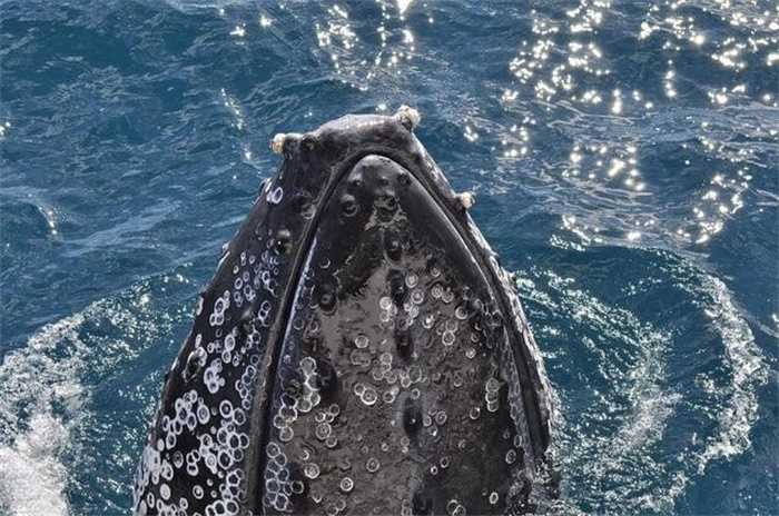 1、大量的藤壶黏附在座头鲸的皮肤上,导致极度的瘙痒和不适。藤壶有时甚至黏附在座头鲸的眼睛、鼻子和其他敏感部位,使座头鲸的状况更加糟糕。