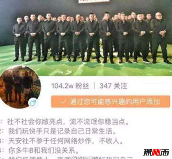 快手表示,对于疑似黑社会的内容和账号,快手有相应的处理规则,一旦发现会视违规程度采取处理视频、限制传播甚至封禁账号的处理。如有需要,也会配合相关部门进行进一步处理。 自成体系、独成江湖的天安社,是一个高调而又隐秘的网红团体。关于文身,天安永义表示:“有时候聚会天气热,喝酒一高兴打光膀子,他们会觉得这么多人满身文身是黑社会,有好多粉丝误认为我们是黑社会。”