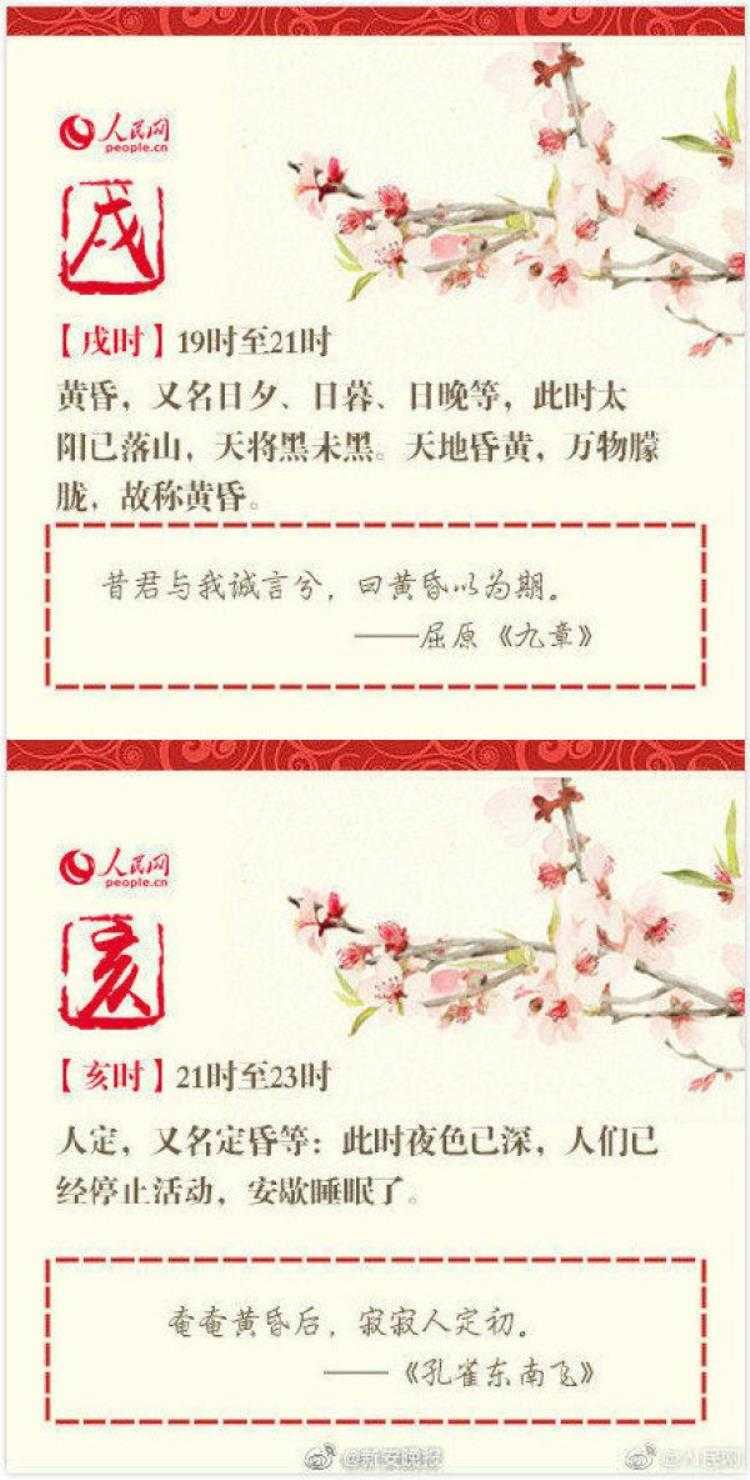 十一、[戌时]黄昏,又名日夕、日暮、日晚等:此时太阳已经落山,黑未黑。天地昏黄,万物朦胧,故称黄昏。(时间19时至21时)。