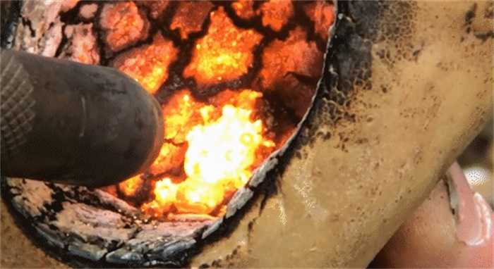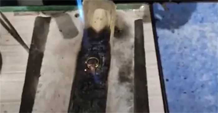 而他们用到的坩埚简单到难以想象,实际上只要一块木头就好了。金铺的工作人员将木头挖个洞,然后用火烤黑,再将碎末黄金放入其中并喷火,没一会儿功夫黄金就熔化并融合在一起了。
