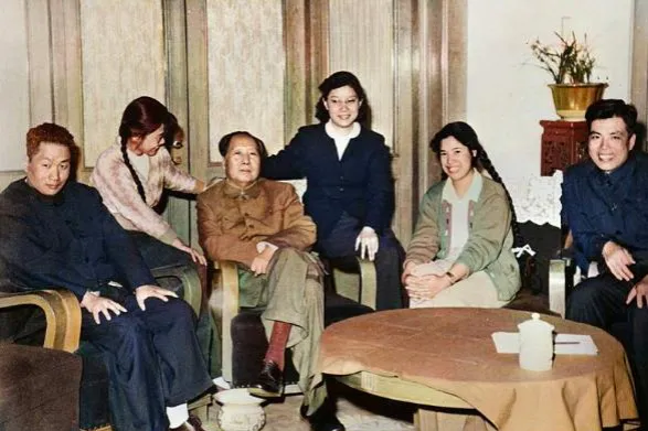 两位伟人罕见全家福,照片中的毛主席坐姿虽然随意,但却充满了一种威严和深邃的气息。