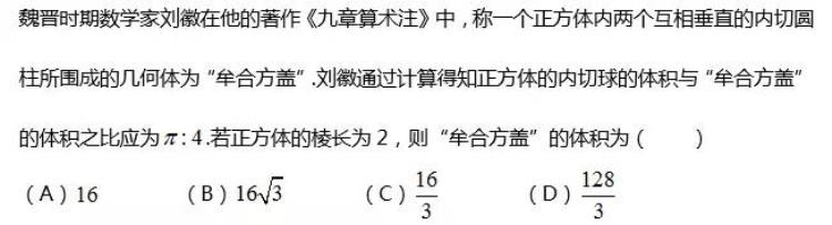 若以一个平行于正方体上下底面的平面,同时截“牟合方盖”与内切球,截面为一个正方形和圆形,且该正方形边长等于圆形的直径,所以正方形与圆形的面积之比为4:π,如下图所示: