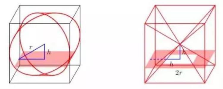 由上可知,两几何体在同一水平位置的截面面积相等,根据祖暅原理,它们的体积相等,右图的体积等于正方体的体积减去两个四棱锥的体积,根据锥的体积公式可知,两个锥的体积之和为正方体体积的1/3,所以该几何体的体积为正方体体积的2/3,即“牟合方盖”的体积为正方体体积的2/3,正方体体积为8r³,所以最终,“牟合方盖”的体积为16r³/3。