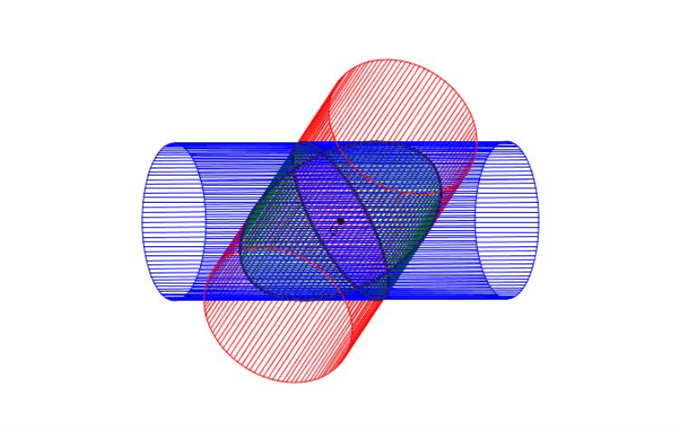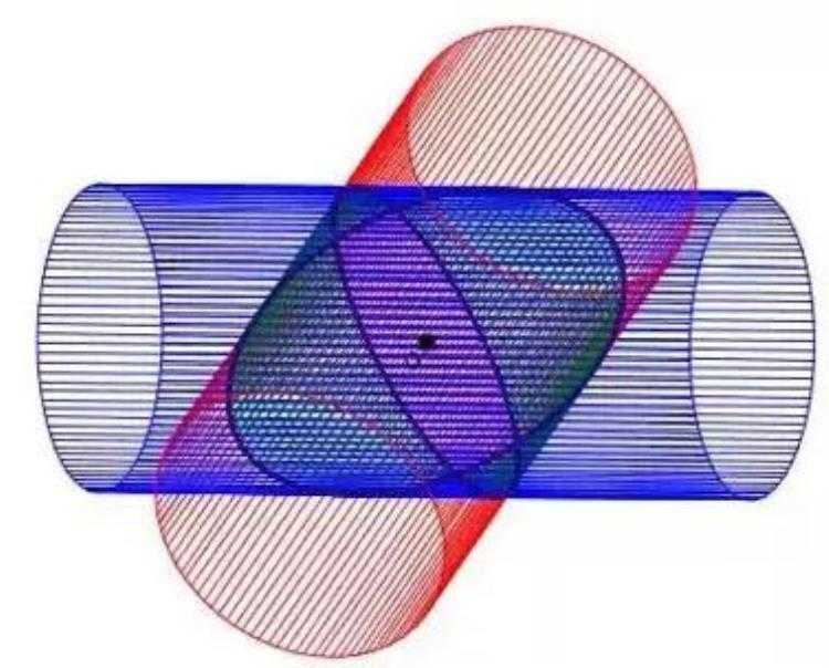 1700多年前,公元3世纪,在那个π还代表着国家数学发展水平的年代(就像如今素数的研究代表了一个国家的数学水平),刘徽不仅算出了3.14(徽率),还准备算球的体积,为了算出球的体积,他想象出了一个东西——牟合方盖按照刘徽的想象,当两个底面直径相同的圆柱垂直相交时,它们的交集产生了一种特殊的几何体,刘徽称之为“牟合方盖”,如下图所示: