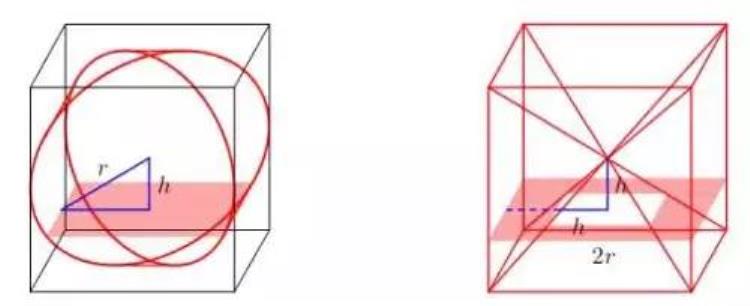 上面右图是一个正方体挖去了两个四棱锥(这两个四棱锥分别以上下底面为底面,以正方体的中心为顶点),设正方体边长为2r。以平行于底面的平面同时截“牟合方盖”和“右图的几何体”,所得截面如上图所示。