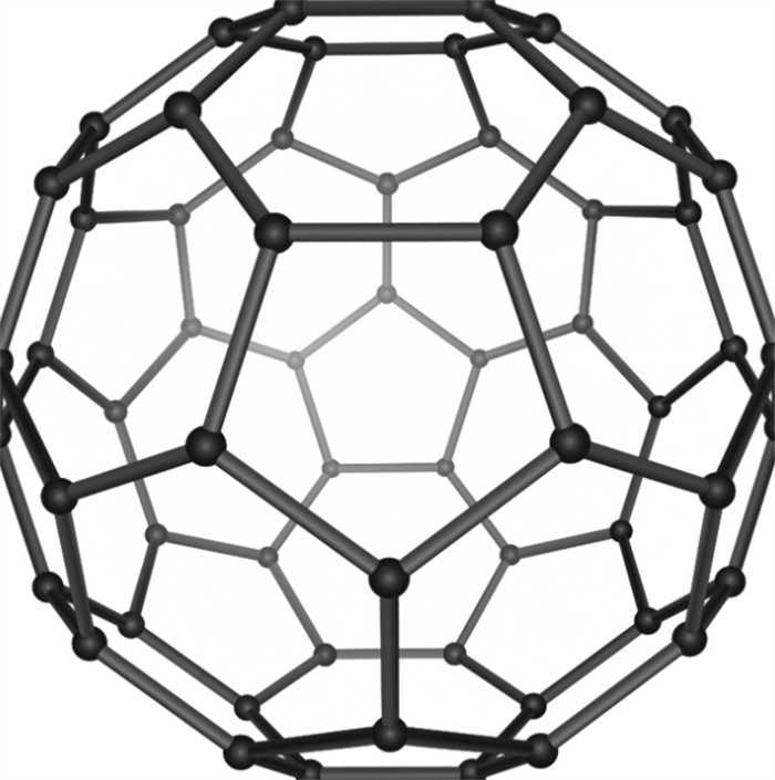 但与石墨烯不同的是,富勒烯是将单片碳原子形式转变成了一个“球状”,每个分子由60个碳原子组成,而这60个原子组成了20个六边形,以及在六边形中散布着12个5边形。