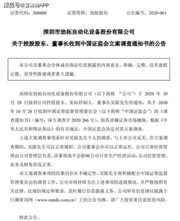 我们知道,最近有个新闻引起了人们的热议,那就是劲拓股份董事长吴限被罚两亿元,这真的让人觉得非常的震惊。证监会到底为何会做出如此严重的处罚?主要是因为劲拓股份董事长操纵股价被证监会处罚。