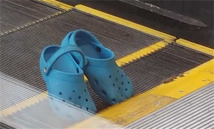 洞洞鞋的主要特点是舒适,这意味着鞋头相对较宽,鞋底也相对较厚。自动扶梯上通常设有小黄线作为警示,我们乘坐扶梯时通常站在小黄线之外。如果穿着普通鞋子,通常不会有问题,但如果是洞洞鞋,由于鞋头较宽,鞋子与扶梯缝隙之间的距离更近。