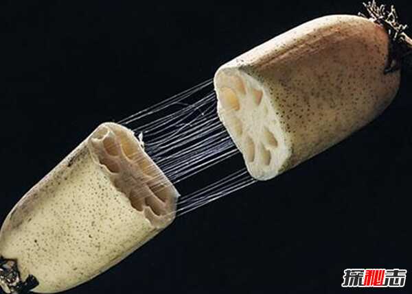 每种植物的导管内壁都会增厚,有些形成梯形,有些形成网形,那么藕的导管内壁同样也会增厚,不过形成了螺旋状,被称之为螺旋形导管。当我们掰断莲藕的时候,藕的导管内壁的螺旋部会突然隔断,然后成为成为螺旋状的细丝。这些细丝呢就像弹簧一样,在能够承受的限度内不会被拉断,一般细丝的直径为为3~5微米,一般可以拉长至10厘米左右。