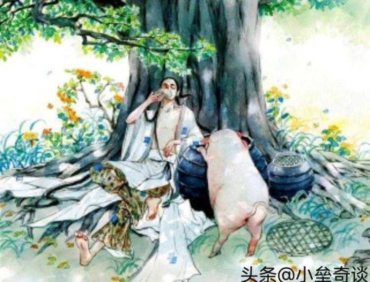 阮咸是阮籍的侄子,他与叔父阮籍同为竹林七贤之一。据《晋书》记载,有一次,阮氏家族众人聚在一起喝酒,当阮咸来了以后,他们就不再用一般的杯子来乘酒喝,而是改用大盆子来盛酒喝,就在大家酒兴正酣时,有很多头猪也跑来凑热闹,群猪来在酒盆前喝酒,这时,只见已经喝醉了的阮咸不管三七二十一跑去和猪抢酒喝,一副阮咸与猪共饮的搞笑画面上演!