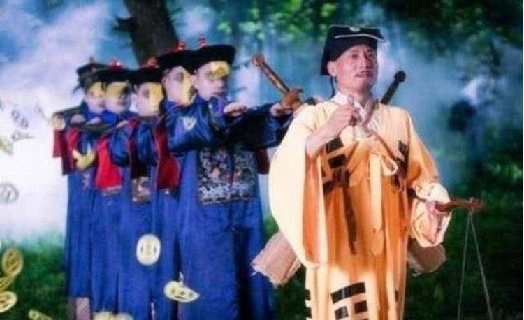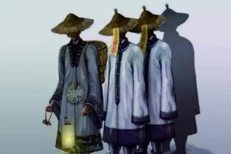 赶尸人在前面拿着摄魂铃,边走边摇,后面跟着一排身披黑色布、脸上和额头上贴着黄纸的尸体,每个尸体间隔七八尺远,摇摇晃晃地前行,就有点像以前港片里的僵尸。