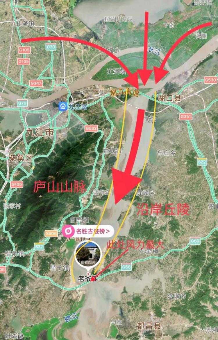 在这条河谷的入口湖口县处,地势开阔,大量的风可以毫无遮挡地从平原地势上灌入河谷内,由于河谷内“狭管效应”对风力的放大,这些风刮到老爷庙这个出口时,风速达到最大,而出了老爷庙这个口子后,“狭管效应”消失,风速立刻又恢复了正常。