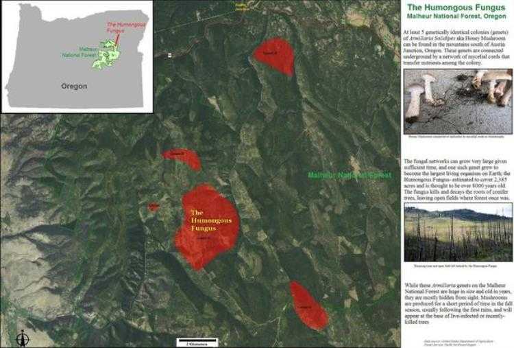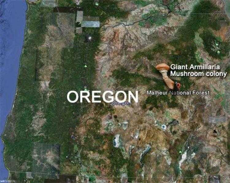 1998年,美国林业局的科学家们在俄勒冈发现的奥氏蜜环菌,占地8.9平方公里,估计已经生长了2400年以上,而分布如此巨大的蜜环菌却是通过菌丝连接起来的一个整体,估计其总质量高达3.5万吨。