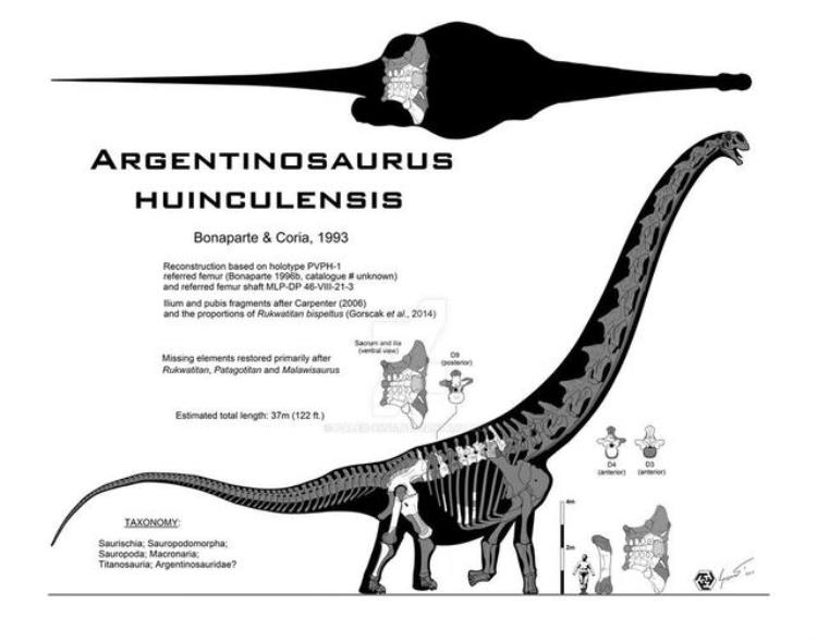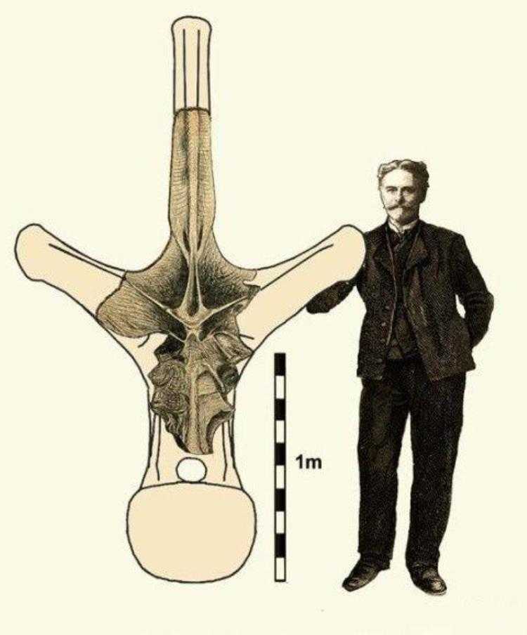 从这部分骨骼推测出了易碎双腔龙的体型可能比蓝鲸还要大!你没看错哦,易碎双腔龙就只有一块骨骼,而且这块骨骼居然还丢了,留下来的只有一份骨骼素描图,所以现在要去翻出来,用计算机重新建个模都有点困难了。