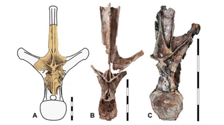 图注:易碎双腔龙化石(A)与雷巴齐斯龙化石(B、C)的对比,