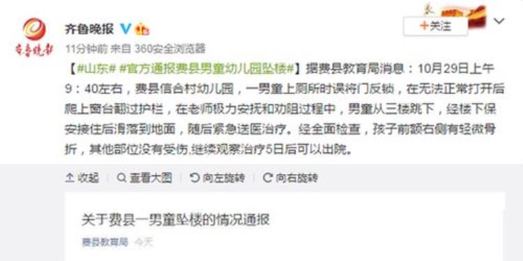一、男童从幼儿园三楼跳下从官方的通报来看,10月29日山东省费县的信合村幼儿园,出现了让人心惊肉跳的一幕。一个男孩在上厕所时,不慎把自己反锁在厕所内。这个男孩在自己不能正常出来的情况下,爬上了比较矮小的窗台然后翻过了护栏。虽然在这个过程中,老师进行了极力的安抚,但是孩子还是从三楼窗户上跳了下来。