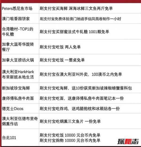 比如YESAWAY国际租车的洛杉矶机场特斯拉5天免费自驾服务、法国春天百货刷支付宝购物,一双春天独家限量版JIMMY CHOO Romy高跟鞋和Florence链条包将获得免单机会、泰国KingPower王权免税,酒店、购物、美食免单以及包含王权铂尔曼五星级酒店住宿1晚,王权免税购物代金券1000泰铢,王权美食街代金券1000泰铢的王权旅行大礼包。