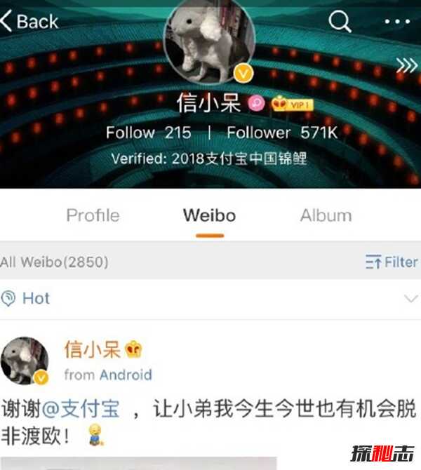 信小呆是支付宝之前发布的一条抽奖微博“中国锦鲤”获得者,三百多万次的转发,中奖几率为300万分之一,运气可以说是非常棒了。