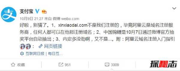 对此,支付宝官方微博在昨日晚间表示:1、xinxiaodai.com不是我们注册的,毕竟阿里云是域名注册服务商,任何人都可以在他那注册域名;2、中国锦鲤是10月7日通过微博官方抽奖平台自动抽出;3、内定多没劲啊,又不是...。并且附上了阿里云域名注册入门指引,趁机为阿里云做了一次宣传。