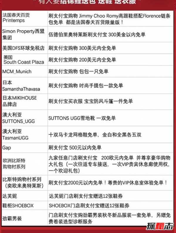 比如YESAWAY国际租车的洛杉矶机场特斯拉5天免费自驾服务、法国春天百货刷支付宝购物,一双春天独家限量版JIMMY CHOO Romy高跟鞋和Florence链条包将获得免单机会、泰国KingPower王权免税,酒店、购物、美食免单以及包含王权铂尔曼五星级酒店住宿1晚,王权免税购物代金券1000泰铢,王权美食街代金券1000泰铢的王权旅行大礼包。