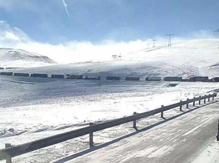 张延斌在驾驶室拍下远处卡车排成长队的照片。