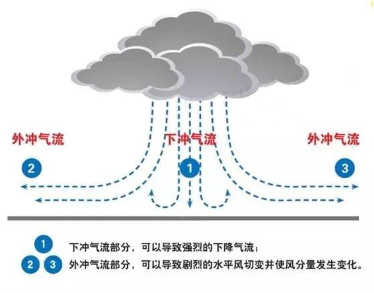 下击暴流示意图,这种天气造成危害是比较大的,如果在机场附近出现则可能出现飞行器坠毁事故,而折断树木则更常见!