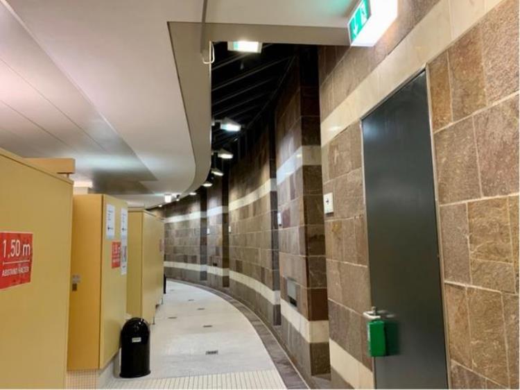 购票后穿过闸机,沿着环形走廊向前就能看见一排排的黄色储物柜和更衣室。卫生状况良好但整体显得有一些老旧。疫情期间无处不在的红色1.5米社交距离警示牌格外显眼。